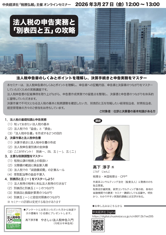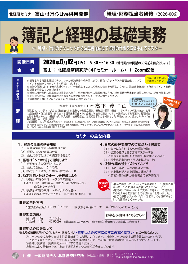 ☆ 【公開セミナー】 「経理のしごと」の入門講座 ☆彡〜 簿記の知識は必ずあなたの武器になる! 経理のしごとの基本をマスター 〜「経理のしごと」の基礎知識 【日時】 3月10日(火)9:30〜16:30 【主催】 ぶぎん地域経済研究所 (048)647-8484 → 詳しい内容(ぶぎん地域経済研究所) ☆ 【ライブ配信】 決算書の読みこなし方と経営分析の基本 ☆彡〜 貸借対照表と損益計算書の読み方と経営分析、キャッシュフロー経営の基本まで 〜![]() 決算書を読みこなすためのコツ 【日時】 3月11日(水)10:00〜17:00 【主催】 日経ビジネススクール (03)6812-8679 → 詳しい内容(日経ビジネススクール運営事務局) ☆ 【オンラインセミナー】 法人税の申告実務と「別表四と五」の攻略 ☆彡〜 法人税のしくみとポイントを理解し、決算手続きと申告実務をマスター 〜![]() 法人税の基礎知識と申告実務 【日時】 3月27日(金)12:00〜13:00 【主催】 中央経済社 → 詳しい内容(中央経済社) ☆ 【公開セミナー】 1日で学ぶ 簿記と経理の基礎 ☆彡〜 簿記の知識は必ずあなたの武器になる! 経理のしごとの基本をマスター 〜「経理のしごと」の基礎知識 【日時】 4月16日(木)10:00〜17:00 【主催】 名古屋中小企業投資育成 (052)581-9545 ☆ 【公開セミナー】 「経理のしごと」入門講座 ☆彡〜 簿記の知識は必ずあなたの武器になる! 経理のしごとの基本をマスター 〜「経理のしごと」の基礎知識 【日時】 4月24日(金)10:00〜16:30 【主催】 常陽産業研究所 (029)233-6732 → 詳しい内容(常陽産業研究所) ☆ 【公開セミナー】 1日で学ぶ 簿記と経理の基礎 ☆彡〜 簿記の知識は必ずあなたの武器になる! 経理のしごとの基本をマスター 〜![]() 「経理のしごと」の基礎知識 【日時】 5月12日(火)9:30〜16:30 【主催】 北陸経済研究所 (052)581-9545 → 詳しい内容(北陸経済研究所) ☆ 【公開セミナー】 1日で学ぶ 簿記と経理の基礎 ☆彡〜 簿記の知識は必ずあなたの武器になる! 経理のしごとの基本をマスター 〜「経理のしごと」の基礎知識 【主催】 SMBCコンサルティング大阪 ☆ 【公開セミナー】 決算書の読み方 ☆彡〜 貸借対照表、損益計算書の読みこなし方と損益分岐点分析の基本まで 〜決算書を読みこなすコツ 【主催】 SMBCコンサルティング大阪 ☆ 【公開セミナー】 会社税務の基礎知識 ☆彡〜 知っておきたい法人税、消費税、源泉所得税、印紙税の基礎知識と実務での留意点 〜法人税の基本知識と健全な税金対策 【主催】 SMBCコンサルティング東京 0120(398)821 → 詳しい内容(SMBCコンサルティング東京) ☆ 【公開セミナー】 会社を強くする「採算管理」と「資金管理」 ☆彡〜 経理リーダー養成! 社長の関心事である「儲け」と「資金繰り」に両方をマスター 〜経理リーダーに求められる役割 【日時】 5月22日(金)10:00〜17:00 【主催】 三菱UFJリサーチ&コンサルティング 0120(398)821 → 詳しい内容(SMBCコンサルティング東京) ☆ ビジネスサロン(TAMA SALON) ☆彡〜 セミナー、オンデマンド講座でのマイペース学習、ビジネスパーソンの学び直し 〜